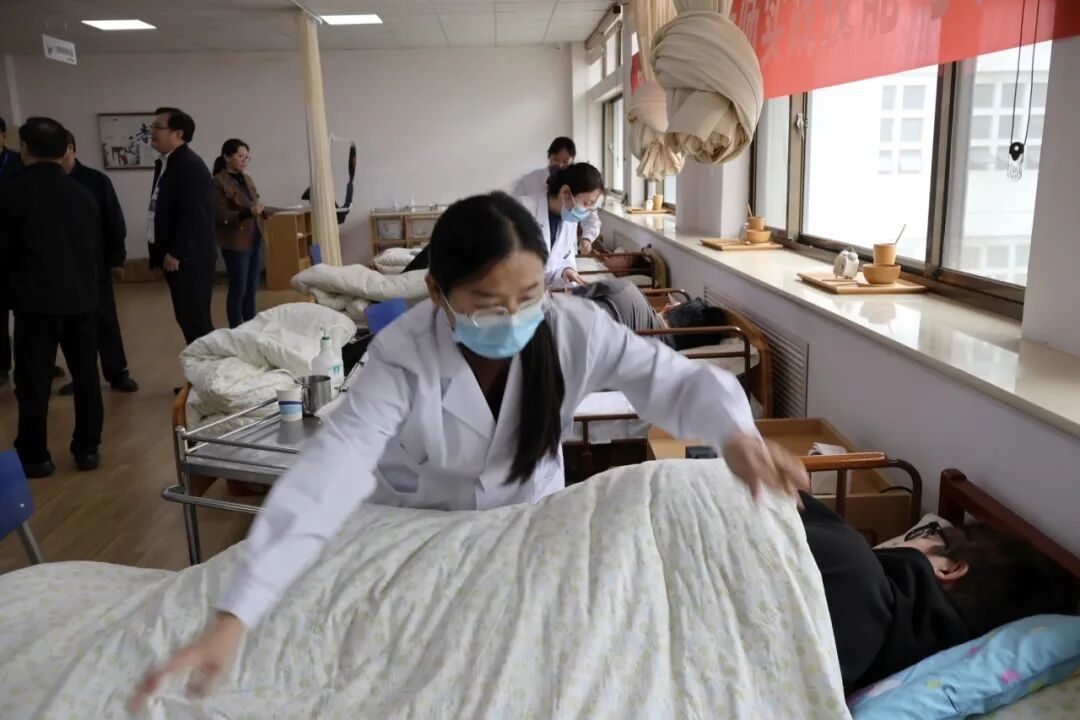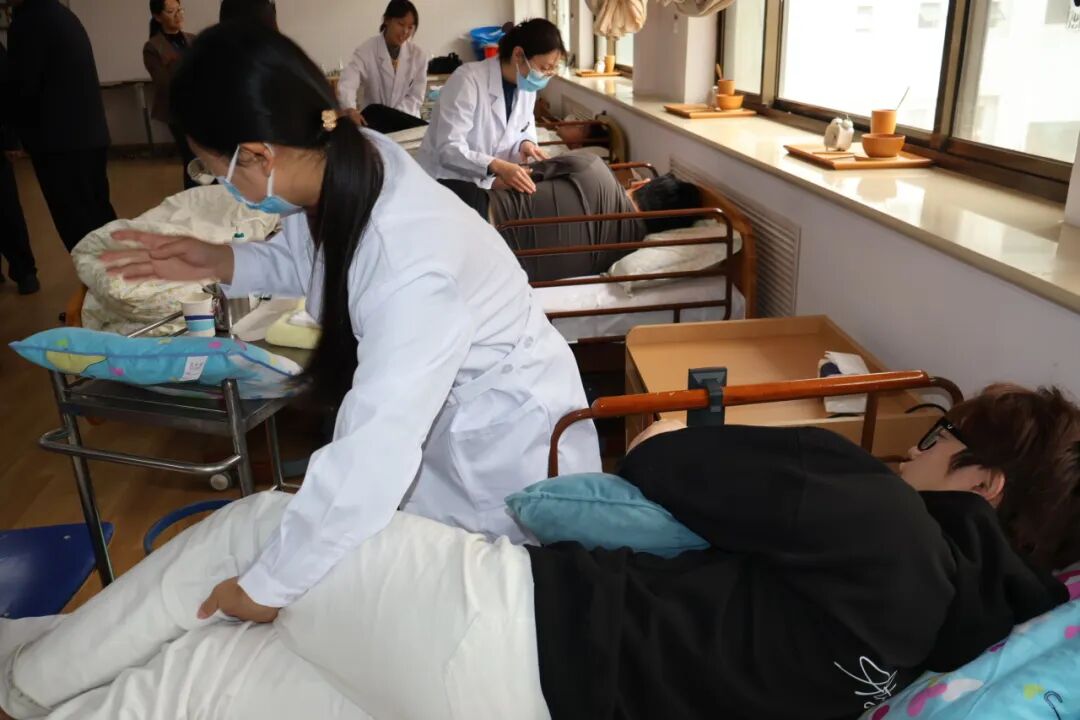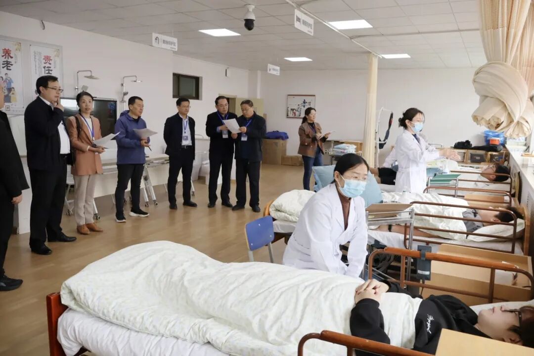 在健康管理学院“叩背排痰操作”项目考核现场,教师们与“患者”耐心沟通,协助“患者”侧身,用恰当精准的力度叩背,使“患者”顺利排痰。