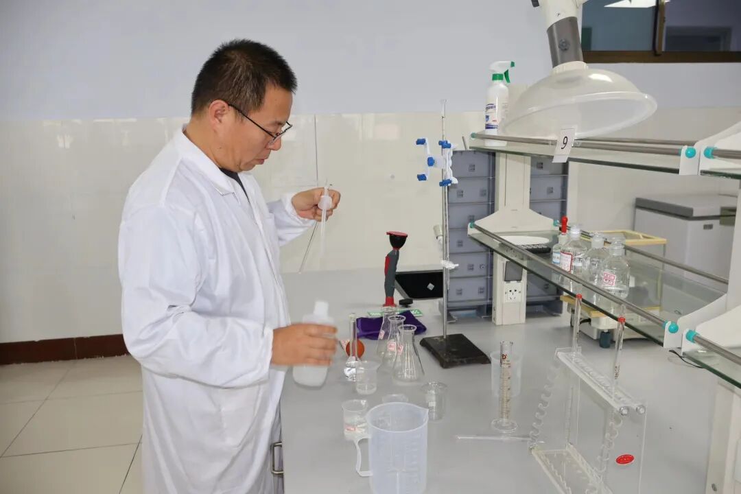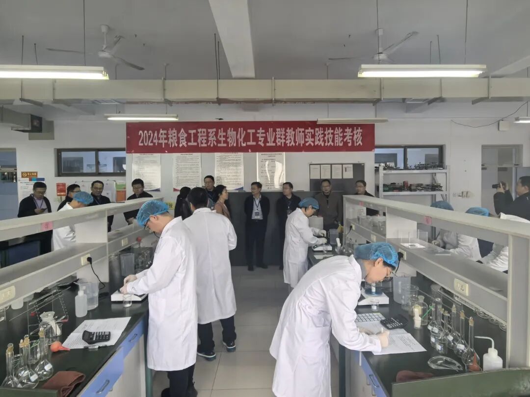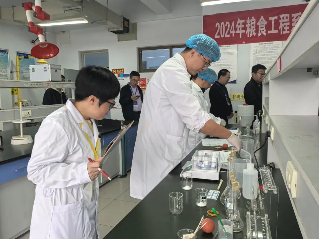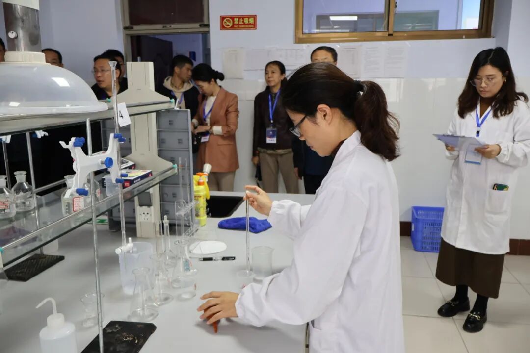 在粮食工程系“ EDTA溶液的配制与稀释”项目考核现场,老师们全神贯注地通过称量、溶解、定容、稀释等过程配制液体。