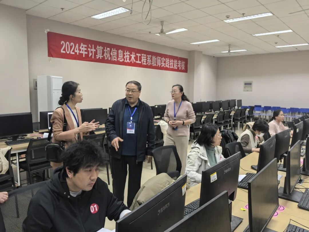 在计算机系考核项目现场,教师们灵活使用计算机,按照项目要求,高效精准完成代码编写、网络规划、网络安全保障等工作任务。