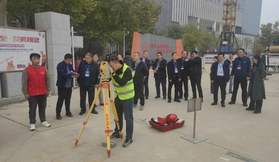 在建筑工程系园林实训基地,教师们架设仪器、校准测量、采集数据,达成“建筑轴线测设”项目考核。
